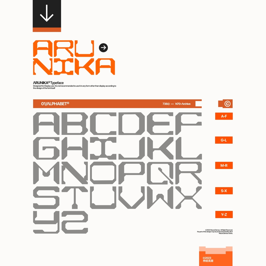 Introduce: Arunika. Futuristic Display Font with a messy futuristic style and 45° angle shape.
