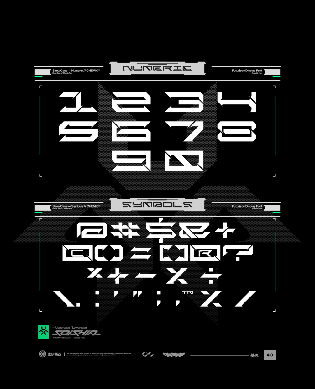 Futuristic Display Font with unique shape and wide glyph. Has a shape with a 45° slope as well as a unique pointed shape.