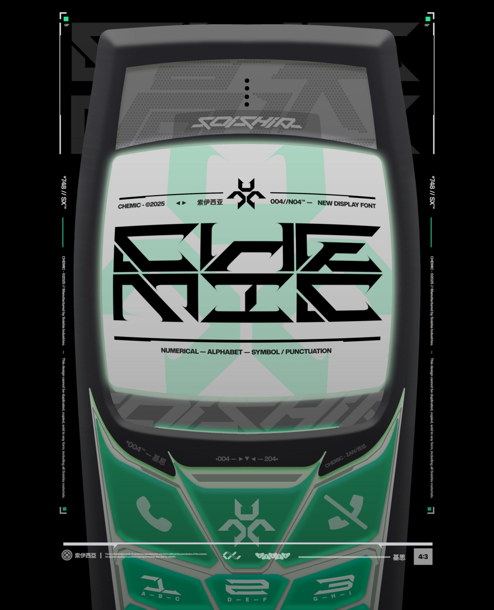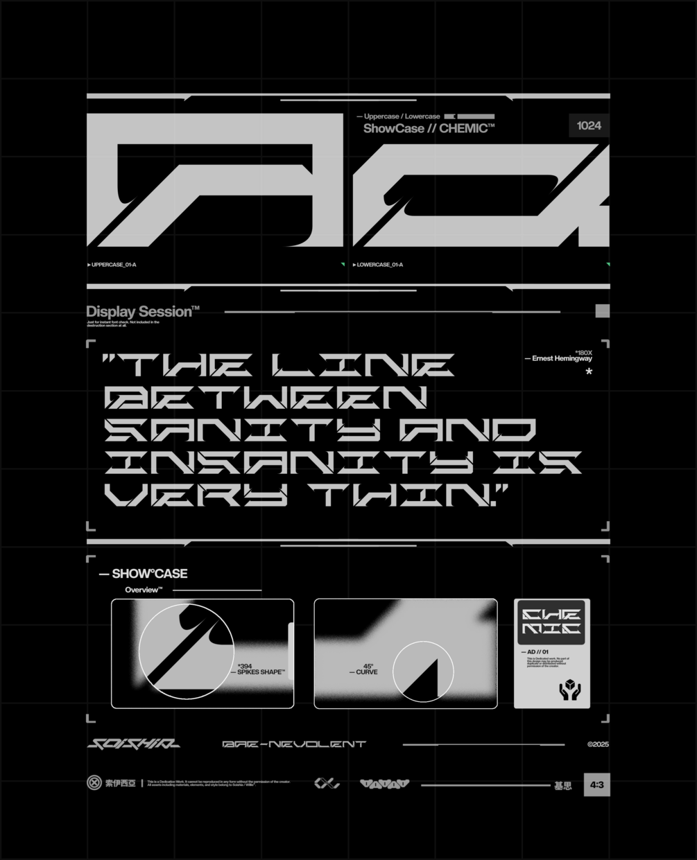 Futuristic Display Font with unique shape and wide glyph. Has a shape with a 45° slope as well as a unique pointed shape.